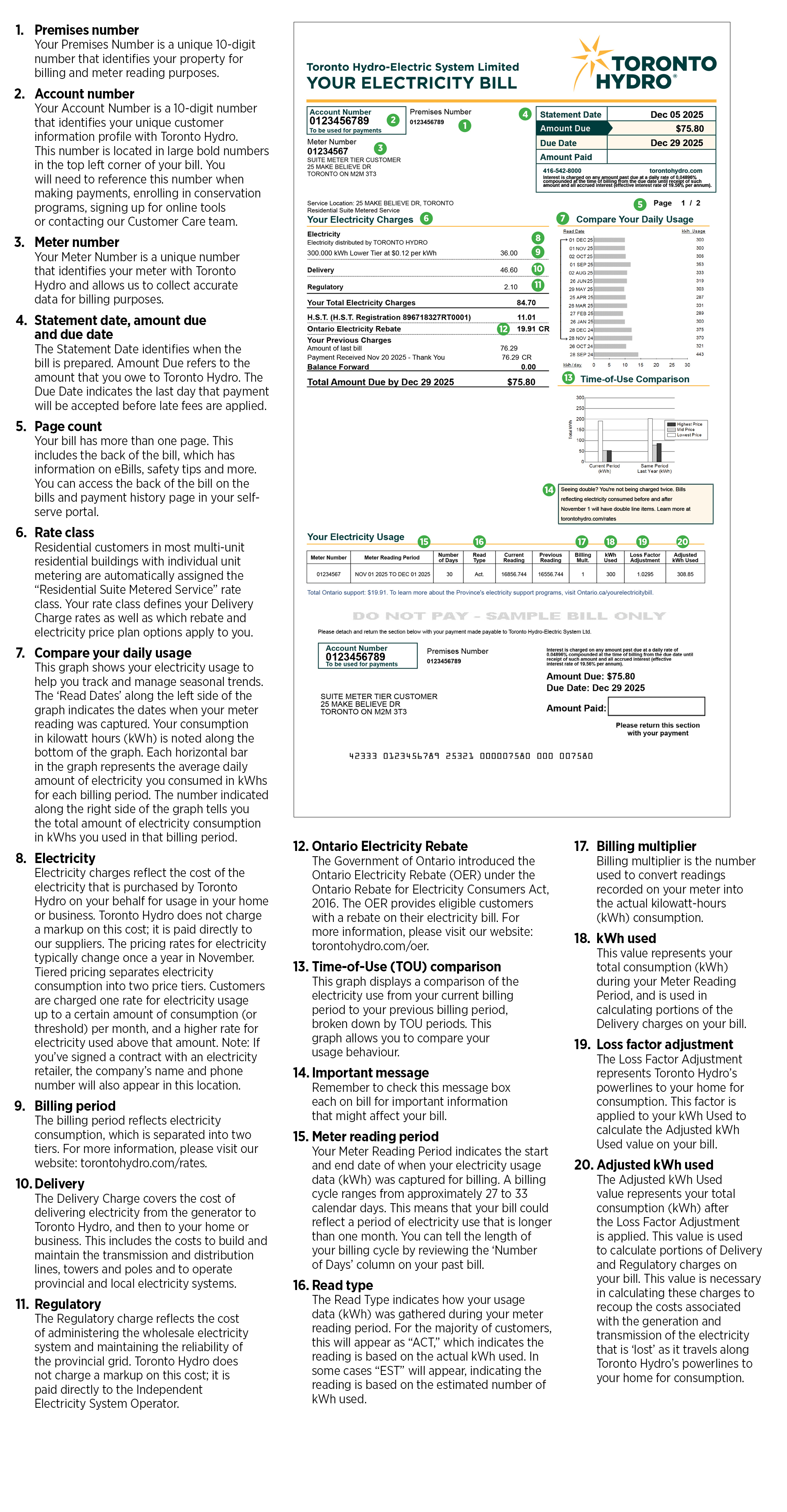 The Statement Date identifies when the bill is prepared. Amount Due refers to the amount that you owe to Toronto Hydro. The Due Date indicates the last day that payment will be accepted before late fees are applied.
