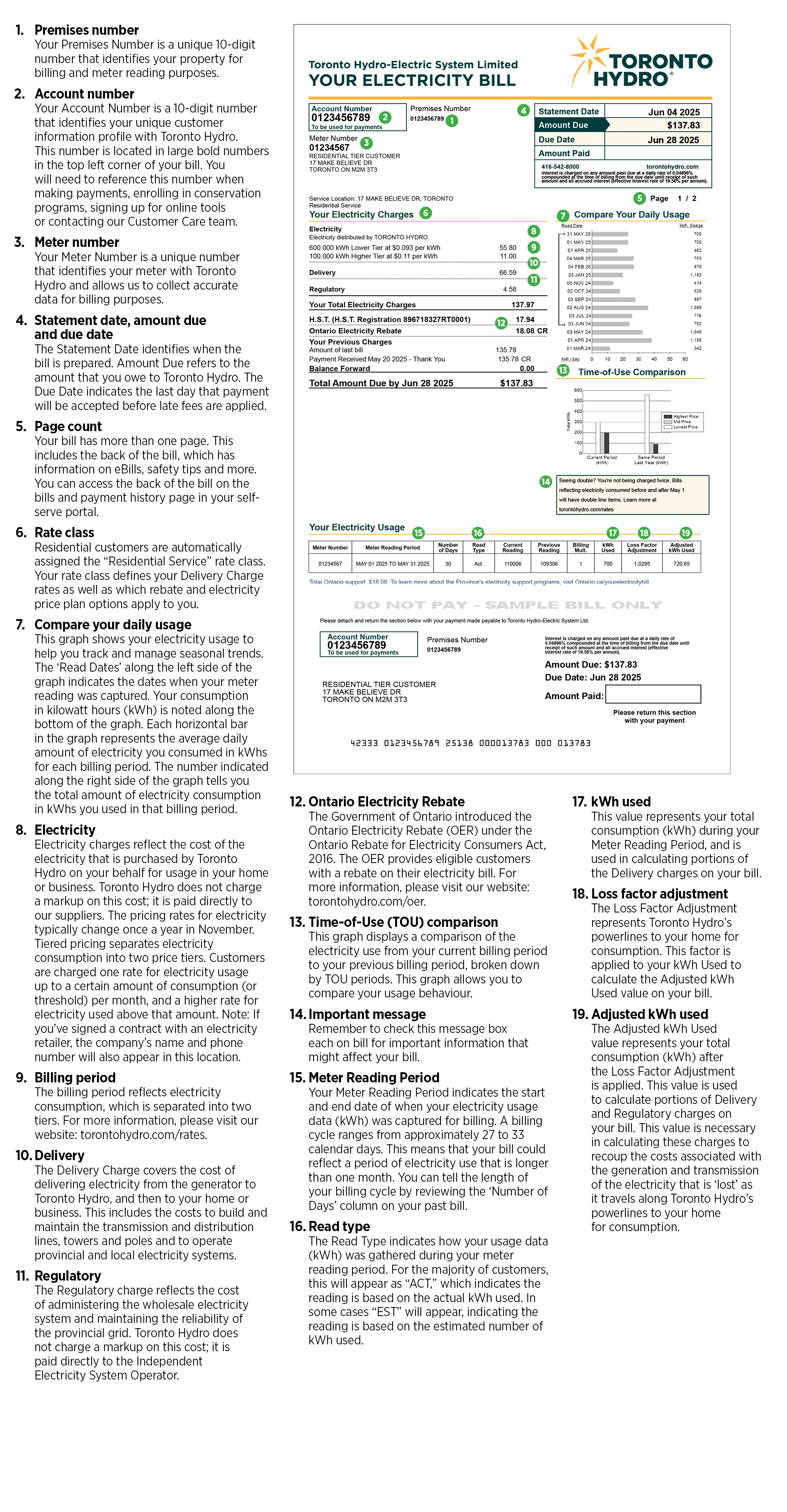The Statement Date identifies when the bill is prepared. Amount Due refers to the amount that you owe to Toronto Hydro. The Due Date indicates the last day that payment will be accepted before late fees are applied.