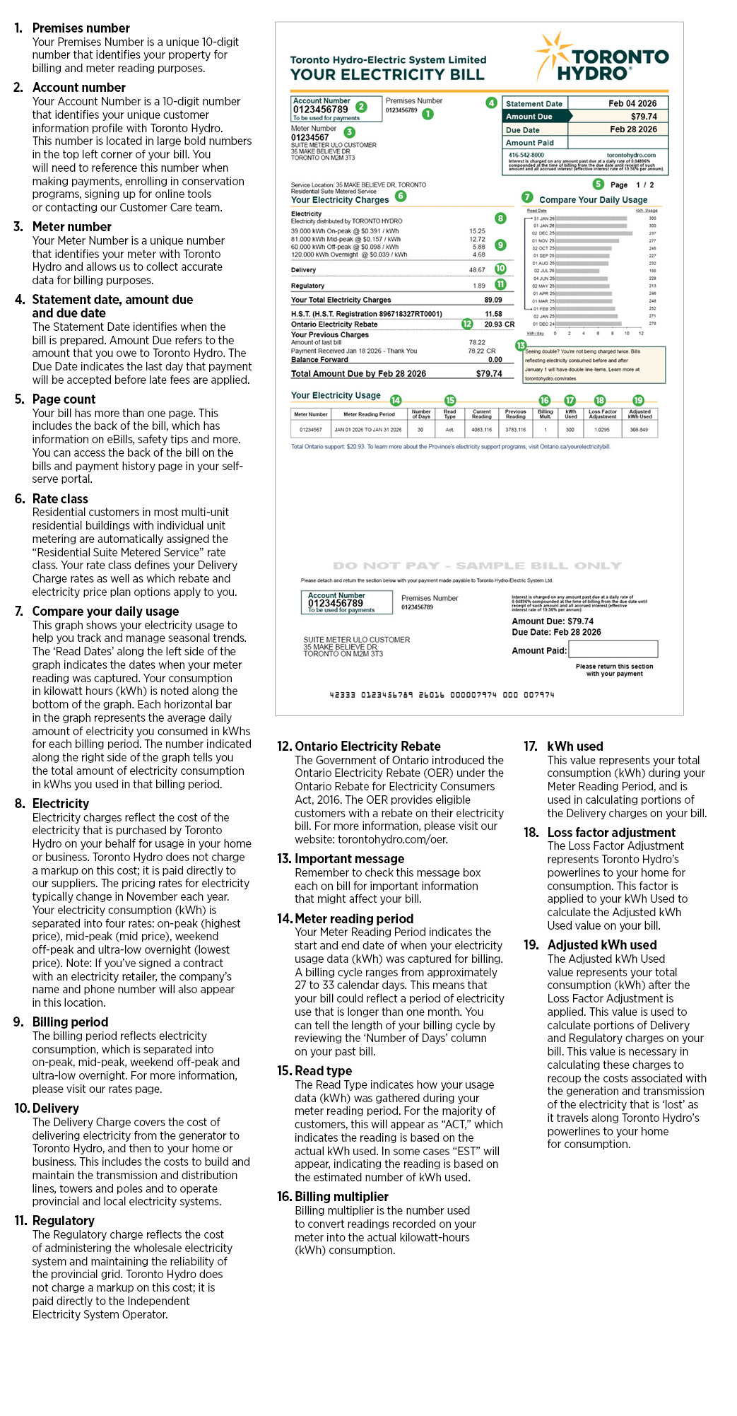 - The Statement Date identifies when the bill is prepared. Amount Due refers to the amount that you owe to Toronto Hydro. The Due Date indicates the last day that payment will be accepted before late fees are applied.
